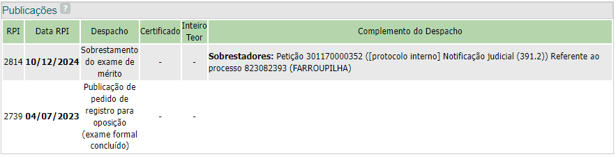 Em 2023, conforme dados do INPI, em 04 de julho de 2023 venceu o prazo para se opor ao registro. Em 10/12/2024, o INPI recebeu um sobrestamento, que é quando o processo fica suspenso por outro motivo, como uma contestação judicial direta.